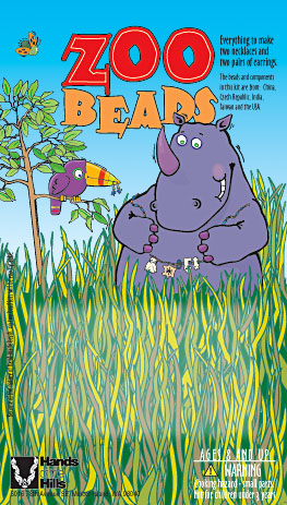 Packaging for retail bead kit. Rigid plastic box of beads, etc. fit on card in lighter area.